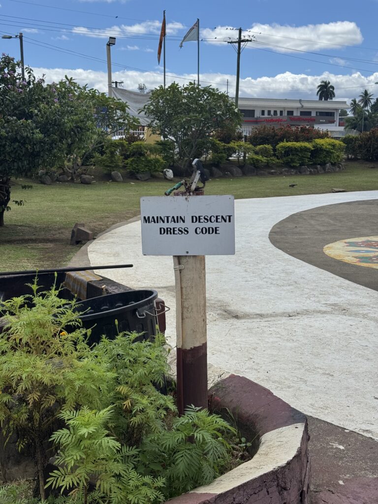 They had us borrow extra garments to ensure our knees were covered, which did lead to one of my favorite signs of the trip asking us to maintain a “descent” dress code. From the temple, we walked into town to go to the local handicraft market and get lunch. There isn’t a lot to do for tourists in Nadi, as most people who come to Fiji are coming for the resorts and the beaches, but it was enough to keep us occupied for the day.