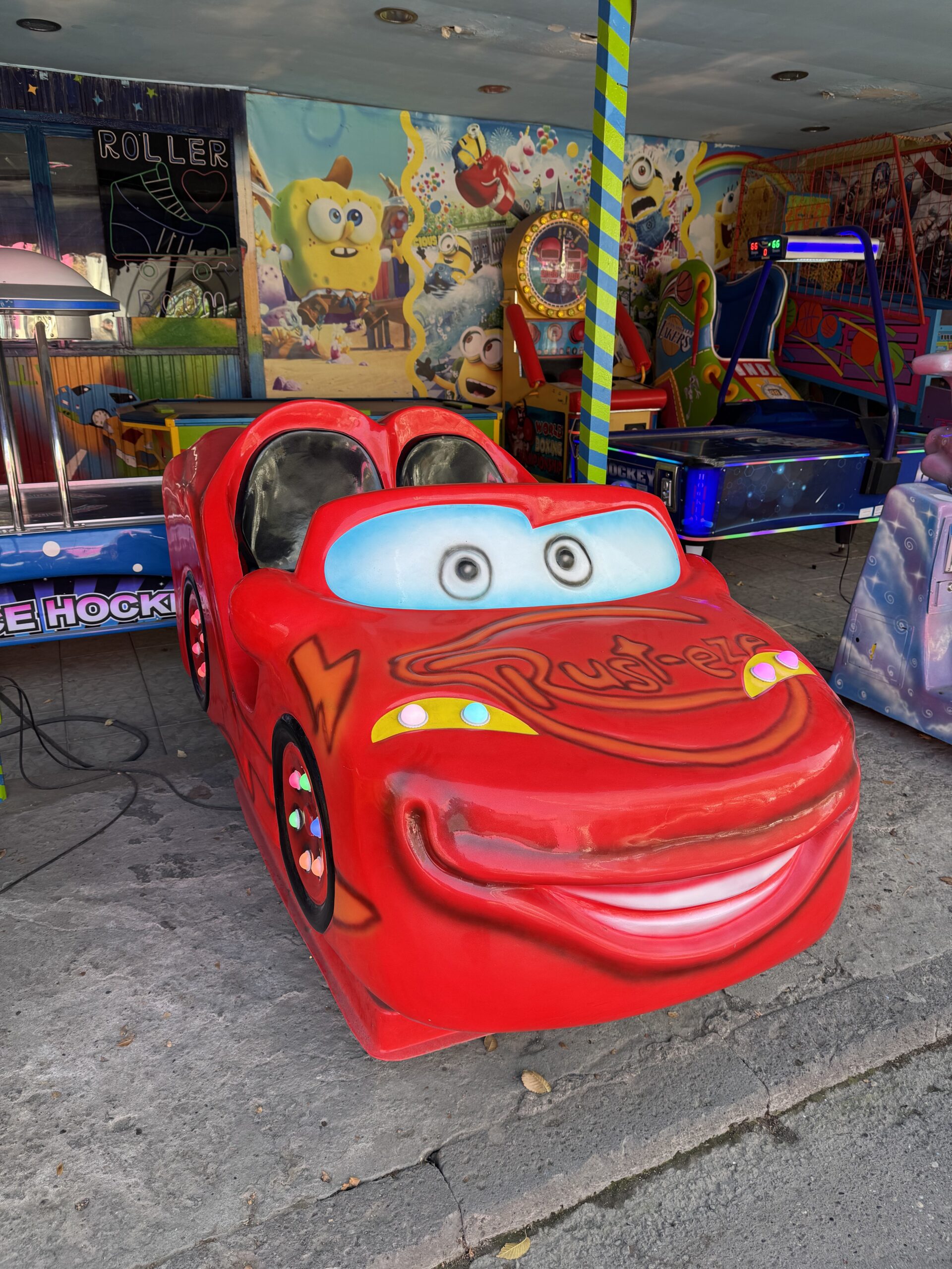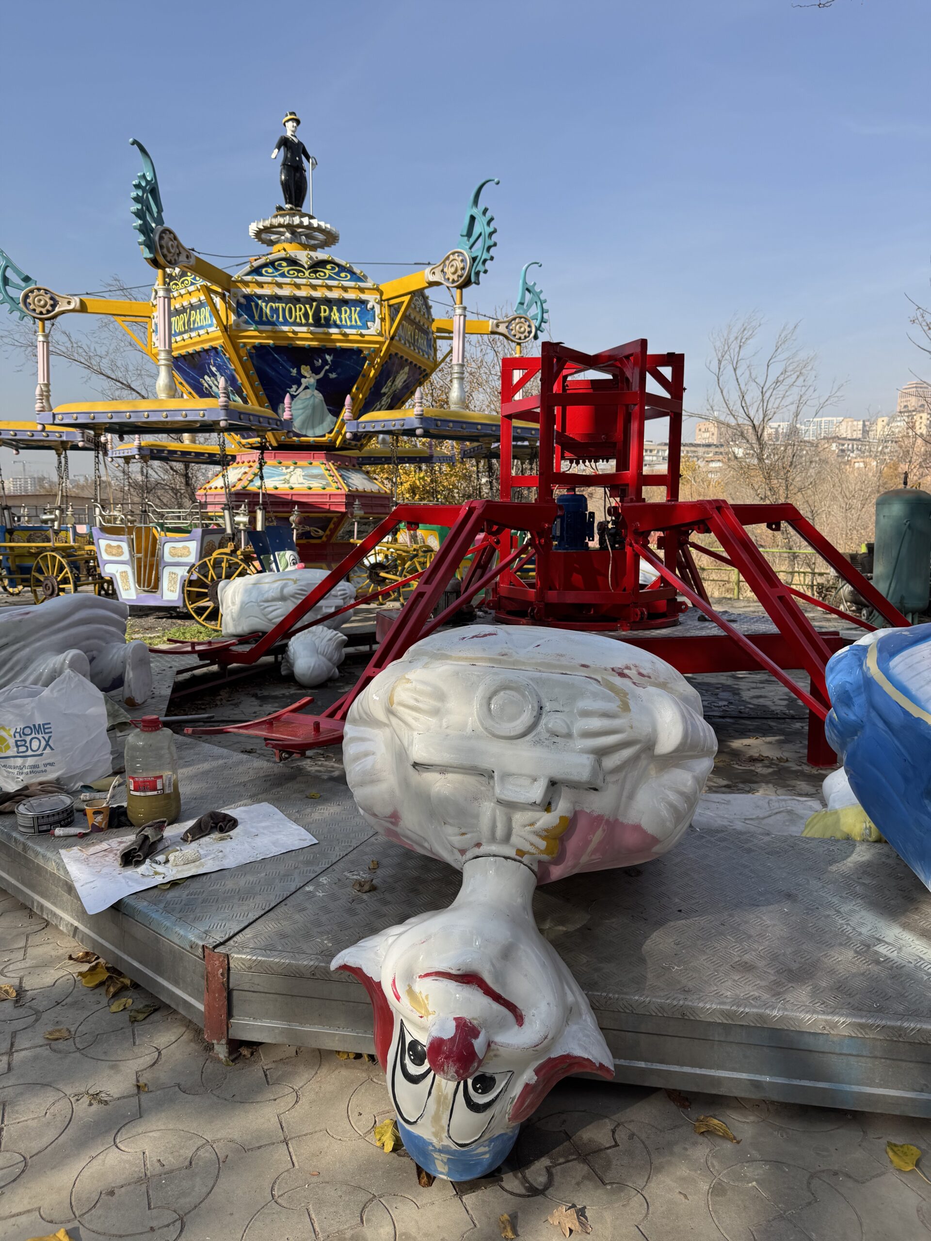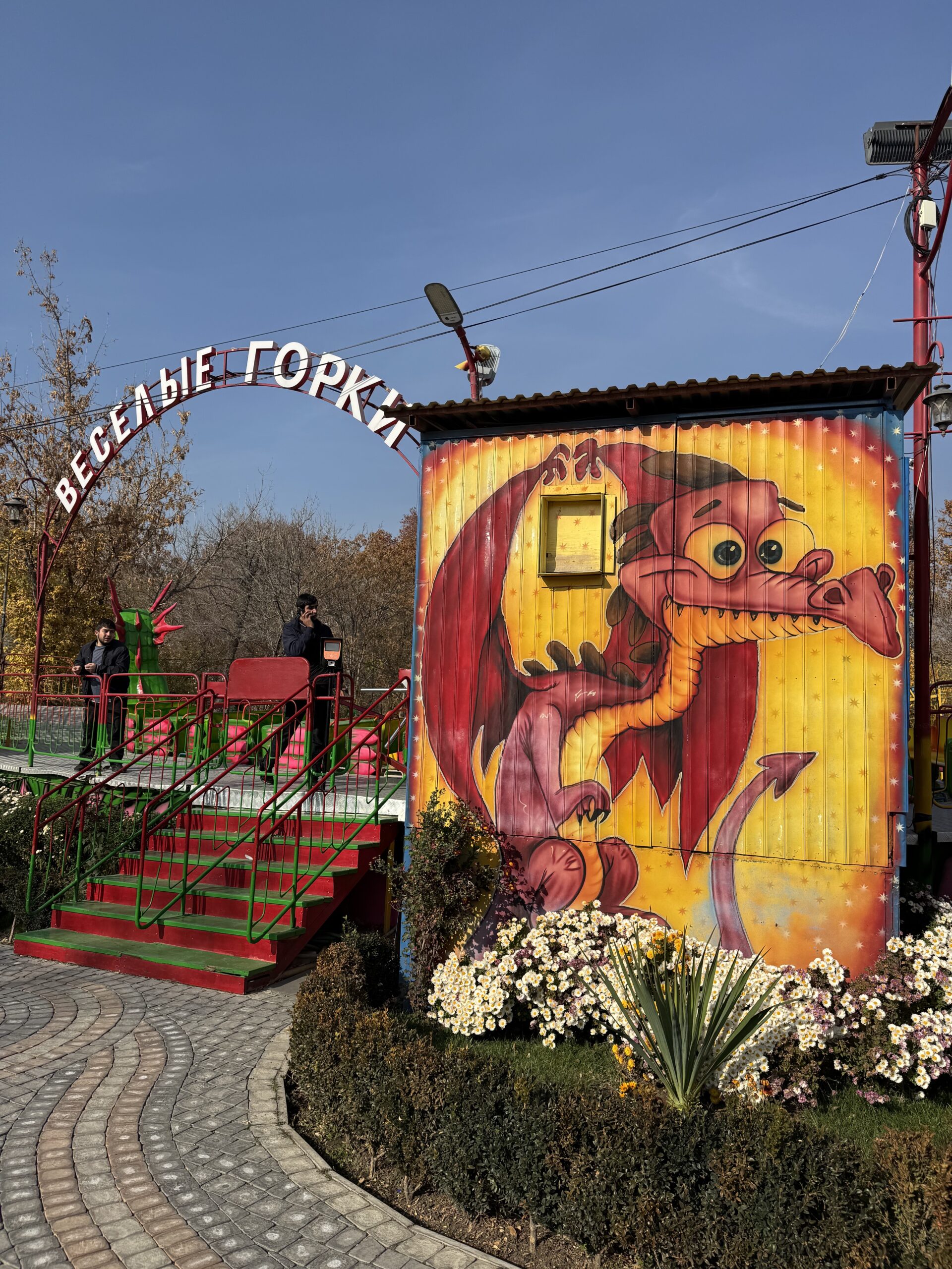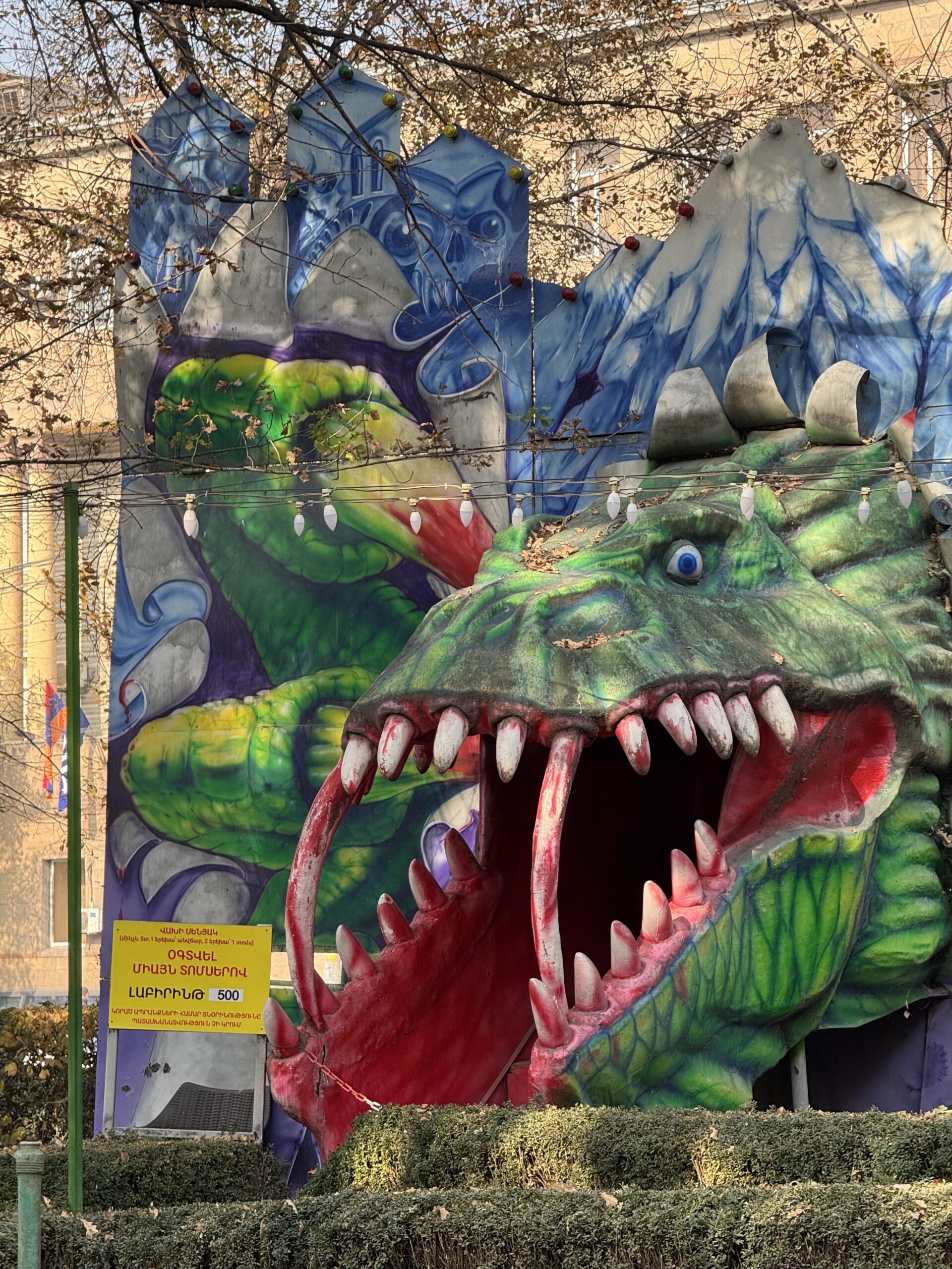 There was so much to love here. Off-brand characters that would trigger a cease and desist letter if Disney or Nickelodeon knew about them. The Mother Armenia statue lurking in the background. The half-built dinosaur park with massive animatronics in the background, which were moving and making screeching noises despite being in an area of the park that couldn’t receive visitors.